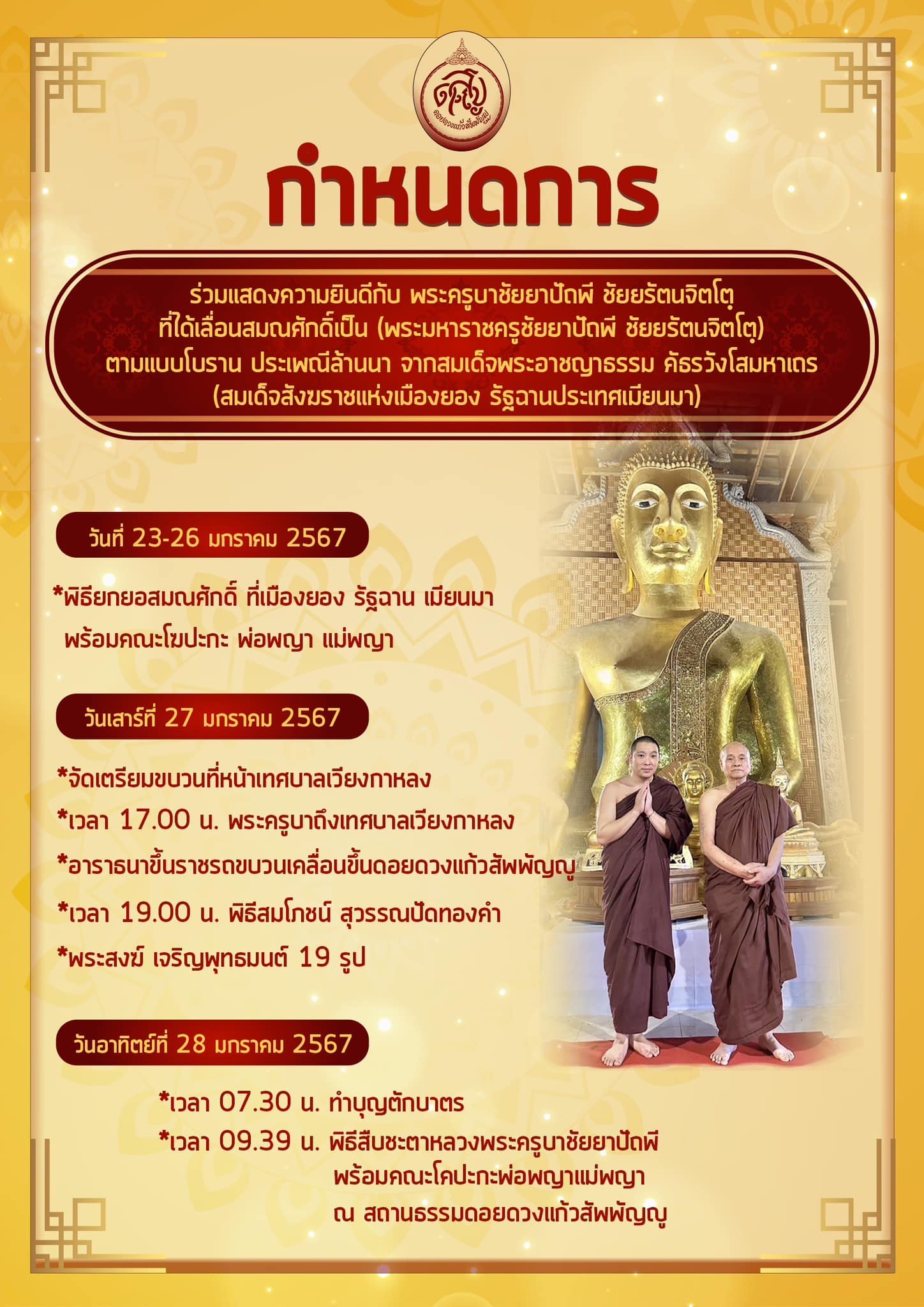 วันนี้ 27 มกราคม 2567 เวลา16.00น. เชิญร่วมพิธีขบวนแห่ องค์พระครูบาชัยยาปัถพี ขึ้นดอยดวงแก้วสัพพัญญู เวียงกาหลง